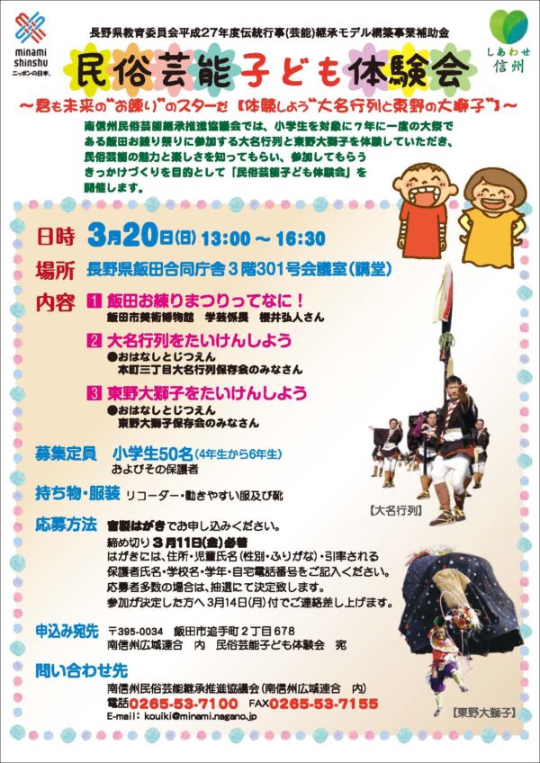 南信州民俗芸能継承推進協議会では、民俗芸能子ども体験会~君も未来の”お練り”のスターだ【体験しよう”大名行列と東野の大獅子”】~を実施します。 小学生を対象に7年に一度の大…